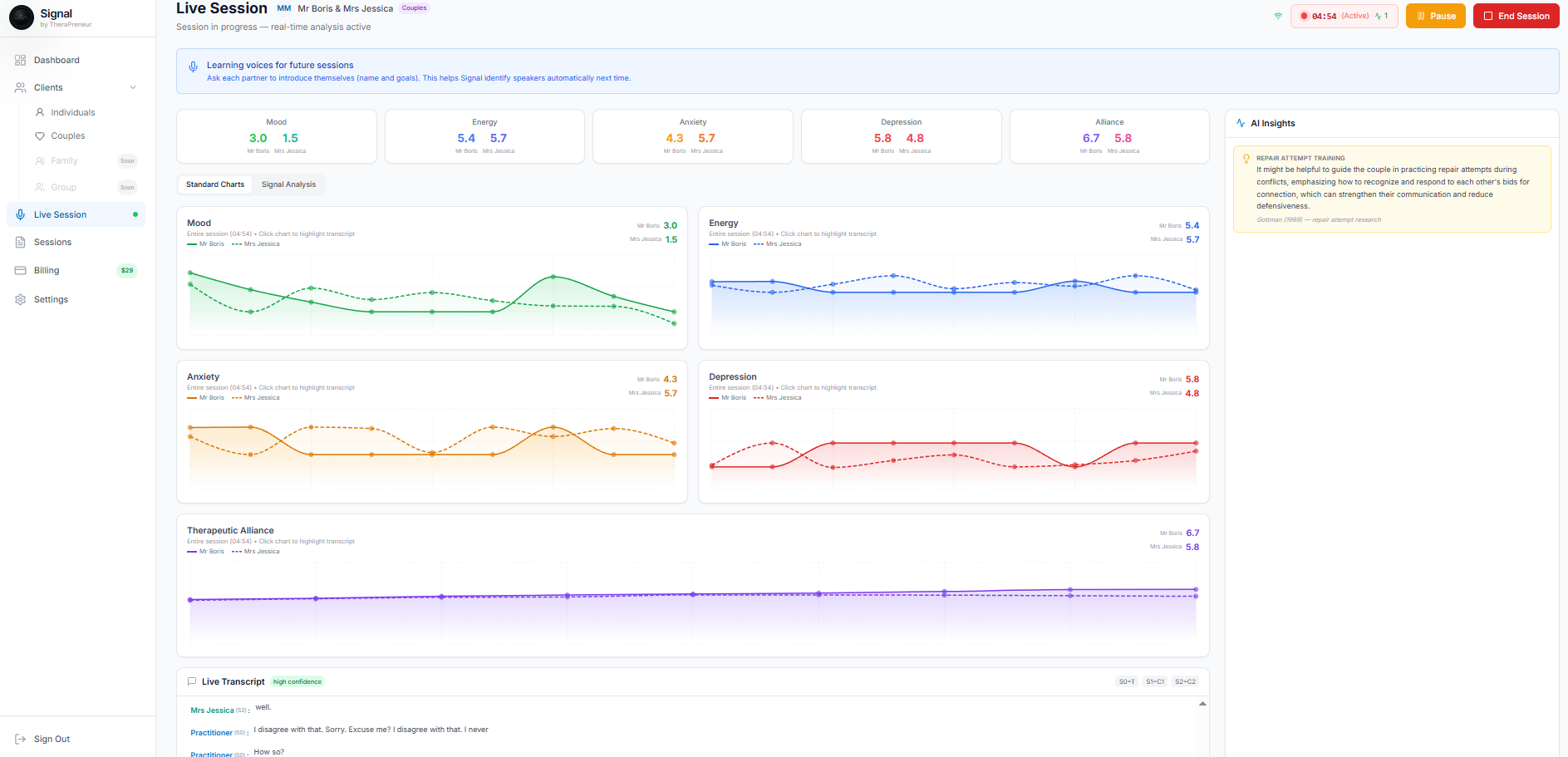 Yes. Signal includes dyadic emotion analysis, per-partner tracking, relational cycle detection (pursue-withdraw, criticize-defend), and couples-specific clinical note formats.